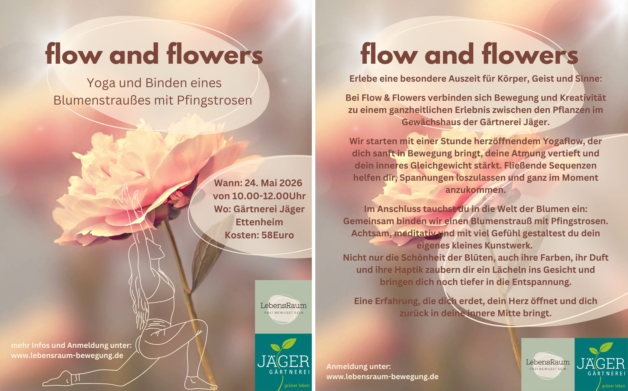Tauche ein in einen besonderen Moment nur für dich: Umgeben von Blumen, Farben und Düften genießt du in unserem Gewächshaus eine wohltuende Yogastunde und gestaltest im Anschluss deinen eigenen Pfingstrosenstrauß. Eine kleine Auszeit, die Herz und Sinne berührt.
